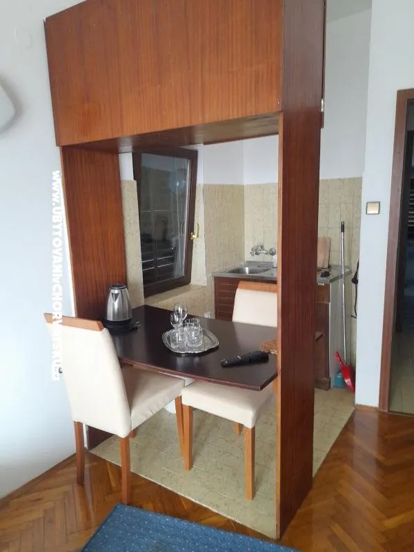 jeden pokoj, kuchyně, koupelna, balkon, druhé patro, výhled na moře, studio apartmán, příjezd a odjezd v sobotuparkovisce privatno free.wi fi free