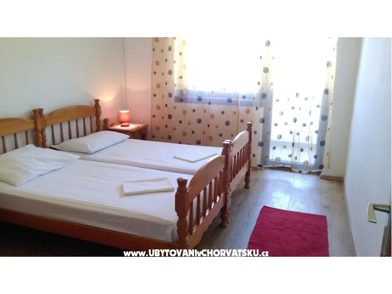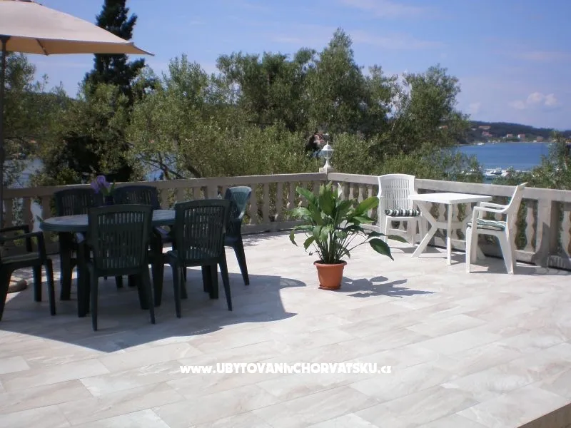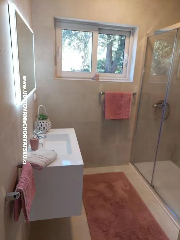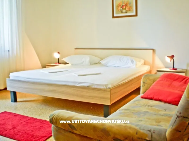 Náš dům má tři apartmány, nachází se na klidném místě s velkou zahradou, zelení a hřištěm na bedminton, s velkou terasou s výhledem na záliv a západy slunce. Je tu gril, všichni mají výhled na moře, wifi, TV-SAT, klimatizace. Dům je ideální pro rodinnou dovolenou. Vzdálenost od malé betonové pláže je 400m a známí písečná pláž San Marino je 5 minut autem a stejně daleko je i staré město.