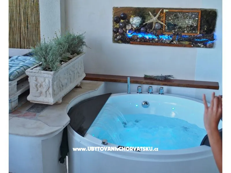 Paní majitelka má nafocen vrchní apartmán s vířivkou na balkóně ten vypadá z fotek velmi pěkně na něj má plno volných termínů ale když si je vyžádáte tak vám nabídne jiný apartmán který je sice na fotkách nafocen a má také vířivku ale je v přízemí a ten vůbec neodpovídá této ceně a ani není tak pěkný. +přízemí +apartmán hned u moře +ložnice mají svoji koupelnu -provoz na silnici hluk v noci -zamčený zadní vchod terasy s věcmi jsme musely zbytečně obcházet -TV 4 programy z toho 2 reklamní český žádný -brzy ráno údržba okolo domu(zametání,mačkání odpadu) -terasa (nevhodné sezení a špatný výhled) -jedna koupelna už něco pamatuje (chtělo by to rekonstrukci)na4*to opravdu neodpovídá -celkově určitě apartmán neodpovídá 4 hvězdám (starší vybavení-koupelna,sedačka,věci kuchyni,skříně,matrace
