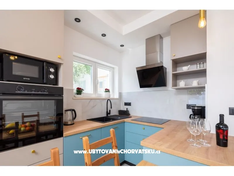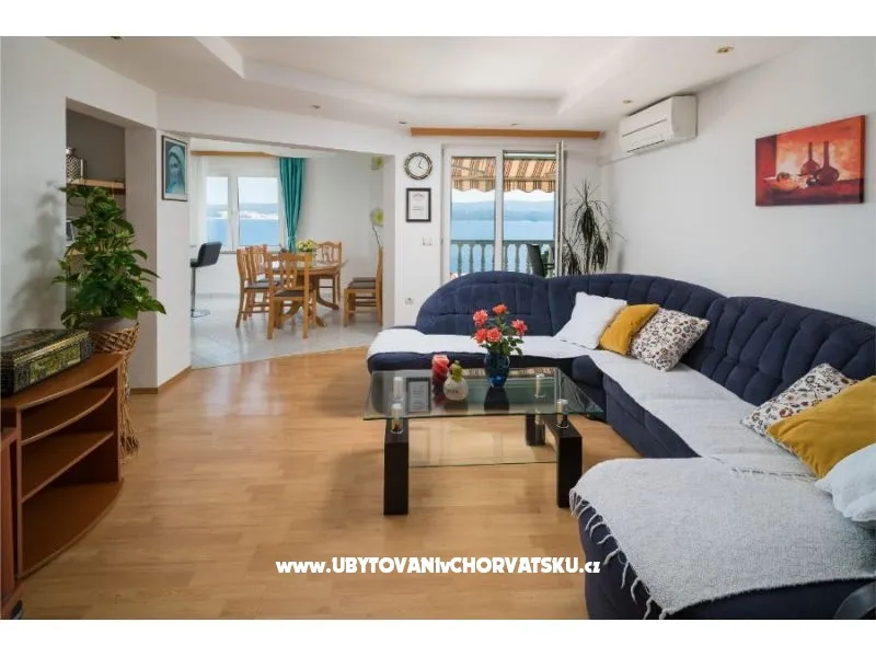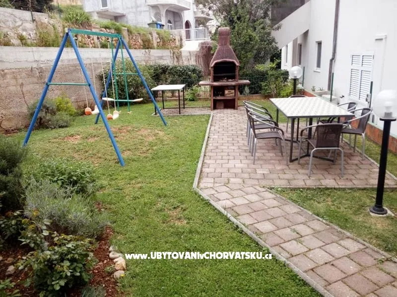 Apartmán s jednou ložnicí s dvoulůžkem a jednolůžkem, koupelnu se sprchou a WC, obývací pokoj s kuchyní, klimatizováno, TV, rozkládací pohovka pro 2 osoby, terasa se stolem, parkování ve stínu.