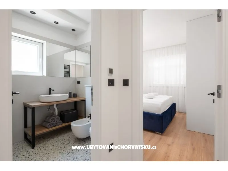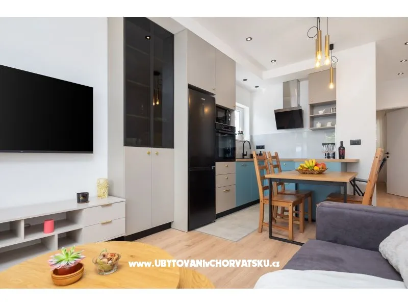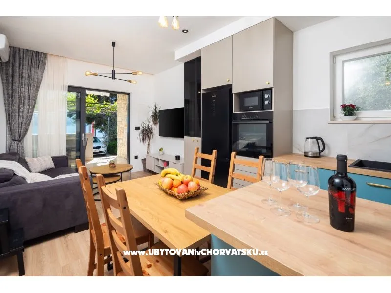 Apartmán s jednu ložnici s manželskou postelí a samostatným lůžkem, koupelnu, obývací pokoj s rozkládacím gaučem, plně vybavenou kuchyň, plochou TV, terasu, klimatizaci v obývacím pokoji a ložnici