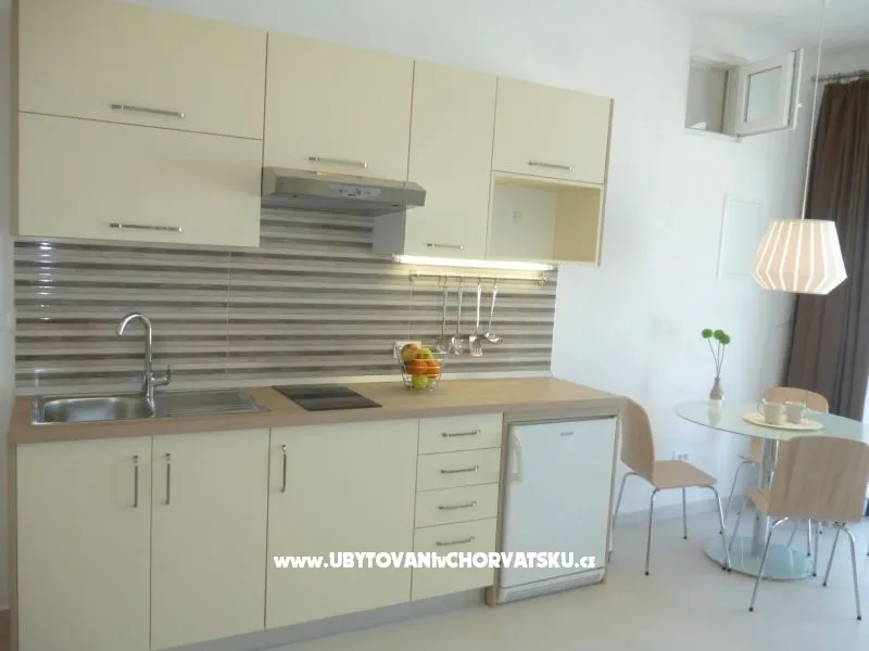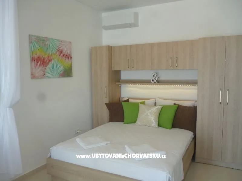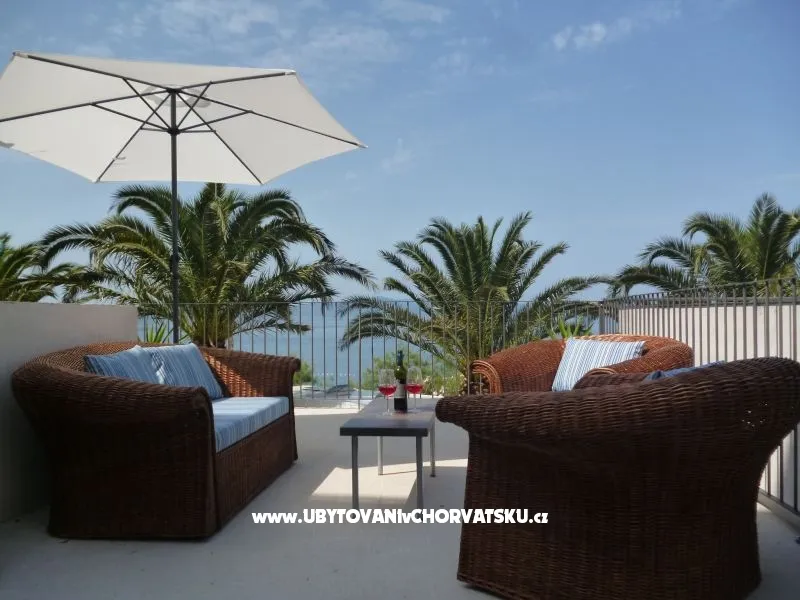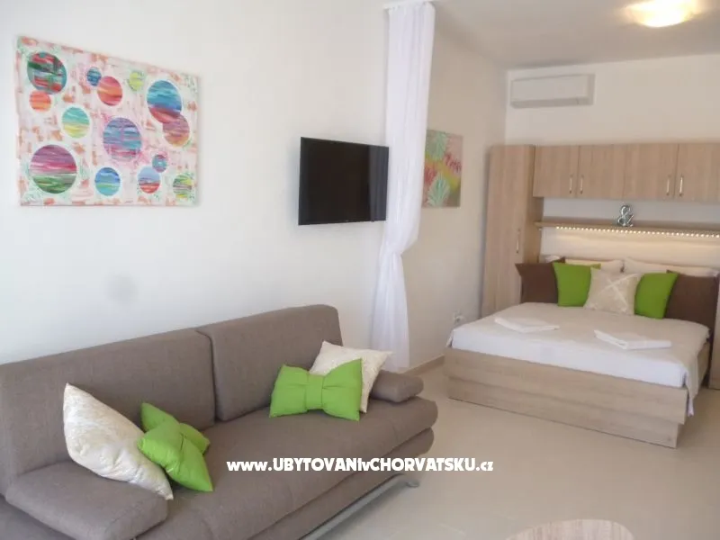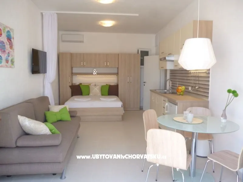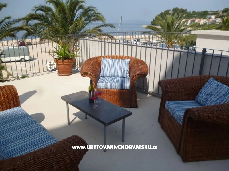 Studio apartman se nalazi u prizemlju kuce prvi red do mora.Fantastican pogled sa terase stvara romantican zalazak sunca kroz palme tocno pred vama.Plaza je pred kucom kao i marina.Sljepa ulica je gotovobez prometa,tiho i mirno okruzenje garantira Vam ugodan boravak.Nudisticka plaza je par minuta udaljena.Dodite i uzivajte .