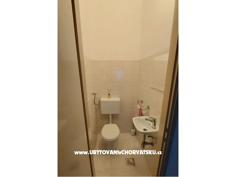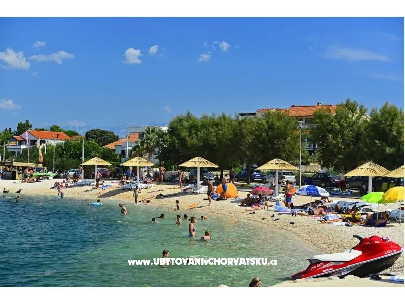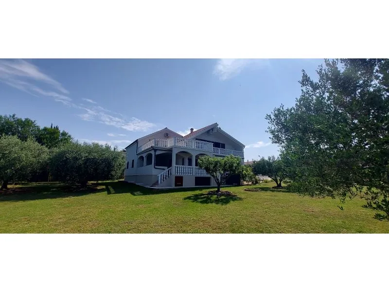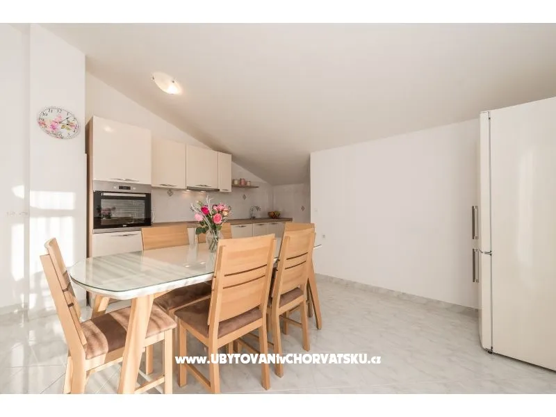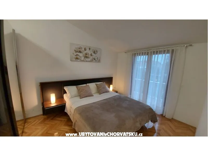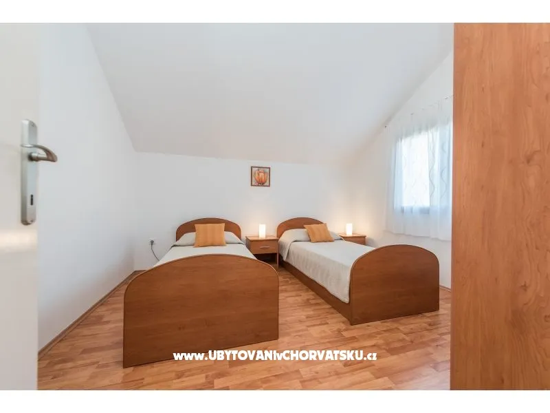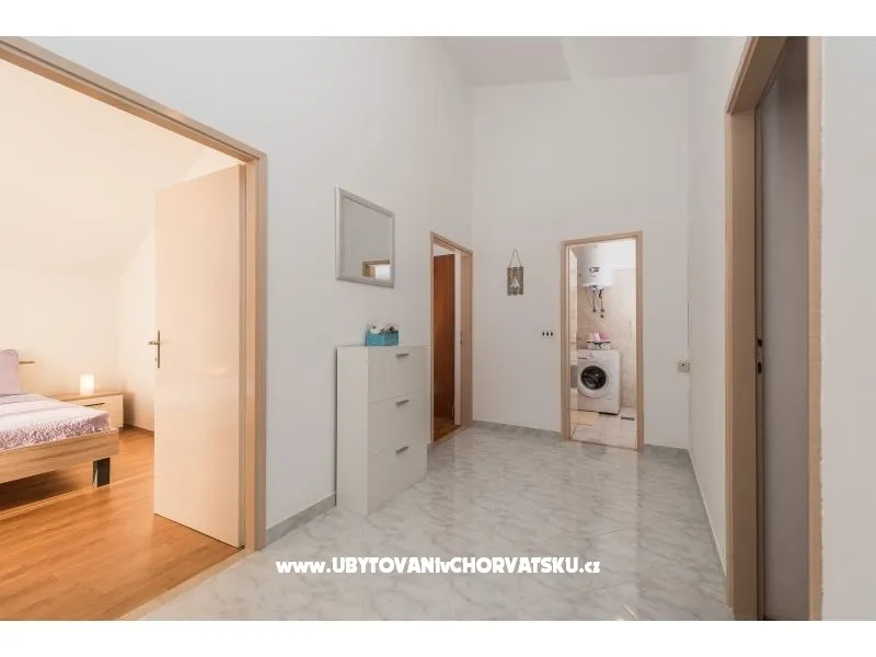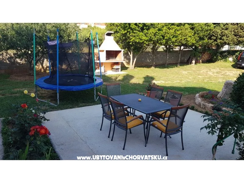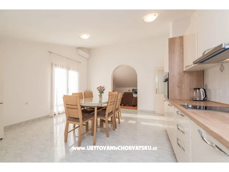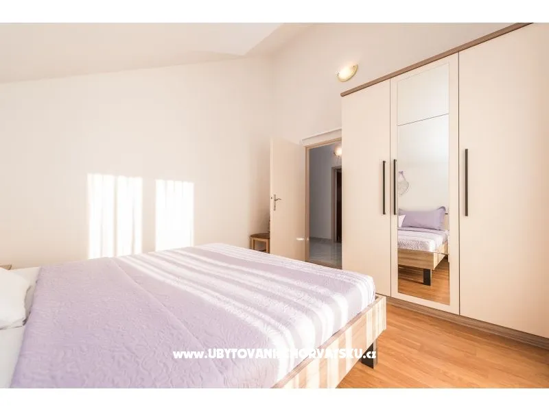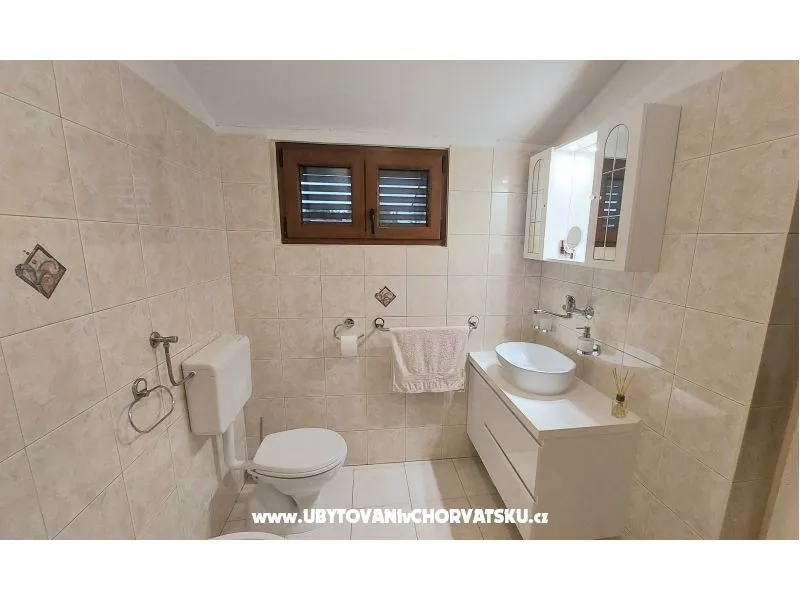 Klimatizovaný apartmán v patře rodinného domu se společným vchodem.WIFI, 3 ložnice, plně zařízená kuchyně s myčkou, obývací, koupelna, navíc wc, 3 terasy z toho 2 s výhledem na moře. Apartmán je obklopen velkým dvorem ideálním pro děti, se zahradou a zahr