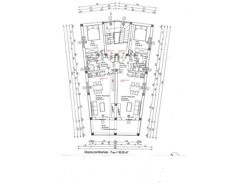 Dvoupokojový byt se nachází v suterénu budovy. Má jednu ložnici, obývací pokoj s kuchyní a jídelnou. Terasa a gril jsou umístěny před budovou.