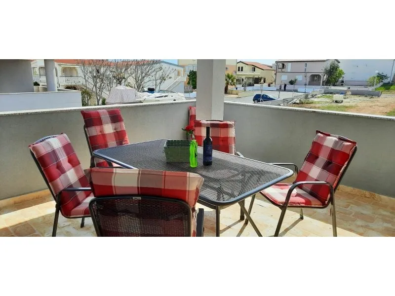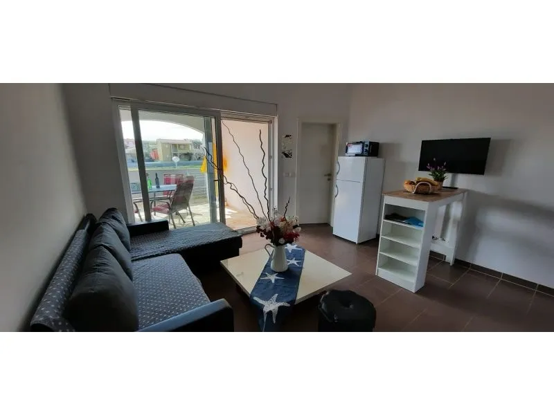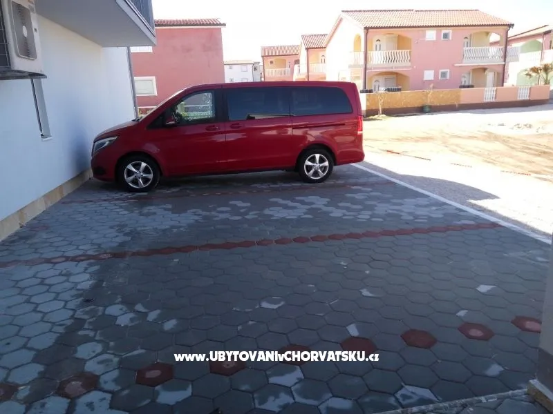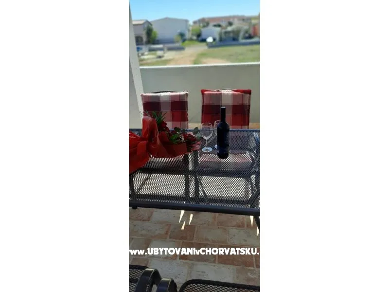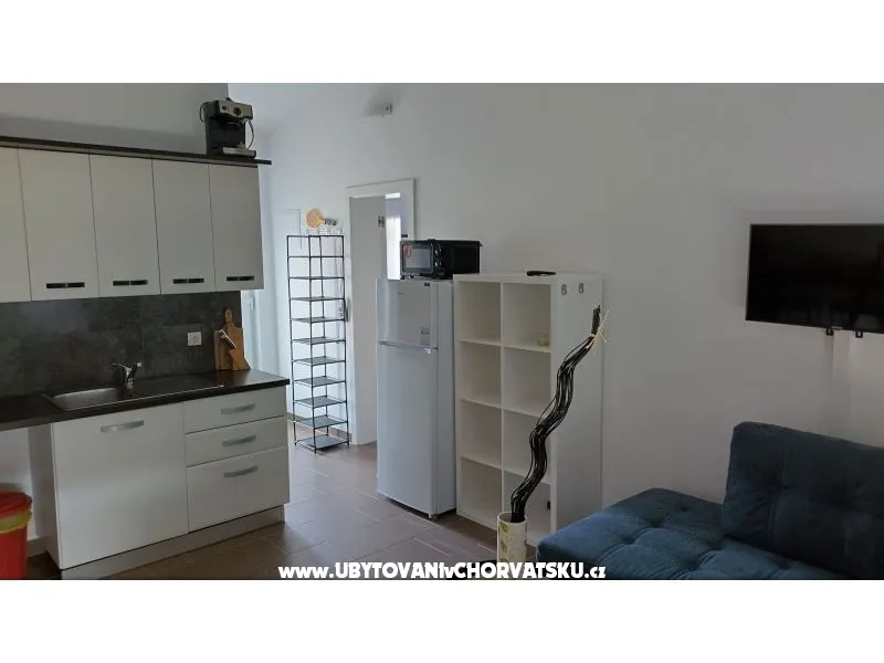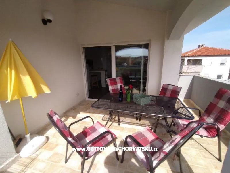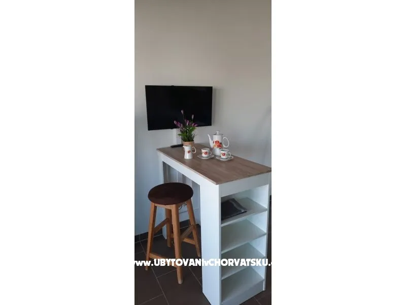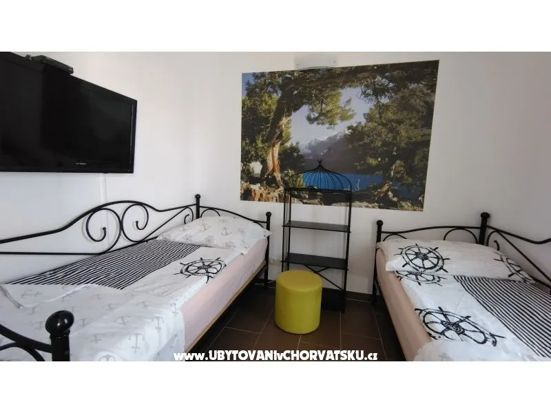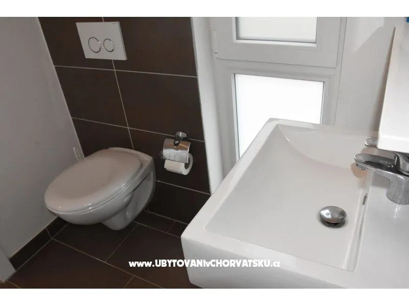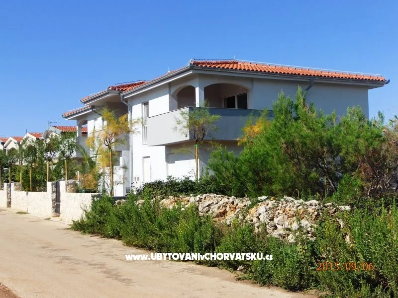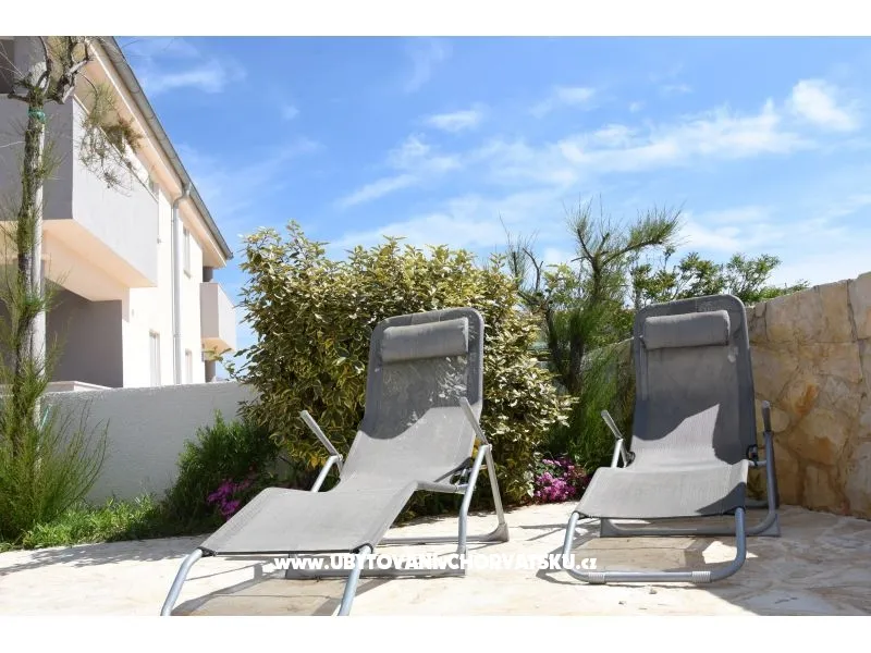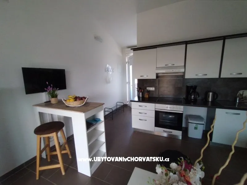 Apartmánový dům byl postaven v roce 2013. Je zateplený, okna mají elektrickou žaluzii a moskytiéru. Voda je ohřívána solárním systémem, který je v případě, že by slunce nesvítilo, doplněn elektrickým ohřevem. Dům má vlastní parkoviště pro 5 automobilů, parkoviště je umístěno tak, aby Váš automobil byl celý den chráněn před sluncem. Na pozemku, který patří k domu je velký gril, který lze používat. Na pozemku je vytvořena zahrada s kamennou terasou a posezením pro Vaši relaxaci. Apartmány jsou umístěny v prvním patře. Každý apartmán má vlastní terasu. K apartmánu je jedno parkovací místo. Apartmán je vybavený klimatizací, okno v ložnici a do koupelny má moskytiéru. Všechna okna jsou vybavená elektrickými roletami. V obýváku s kuchyní je TV momentálně s českou, chorvatskou a německou TV. TV je možno připojit na HDMI nebo USB. V ložnici je jedna dělená skříň s poličkami a věšáky. Kuchyně je vybavená sklokeramickou deskou, elektrickou troubou, ledničkou, mikrovlnou troubou. Samozřejmostí jsou věci jako talíře, skleničky, hrnce, příbory, kávovar… Dolní apartmány mají 80m2 dvě ložnice s obývákem a kuchyní. Oba apartmány maji koupelnu Jeden apartmán má dvě klimatizace, druhý jednu. oba apartmány mají samostatnou terasu pro slunění s lehátky. Tyto apartmány jsou bezbariérové. Do ceny není započítán závěrečný úklid 80€.